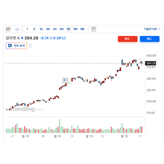 2025년 11월 중순 기준으로 Alphabet(GOOGL)은 연초 대비 50% 이상 상승했고, 주가는 52주 최고가(290달러대) 근처에서 거래되고 있다.